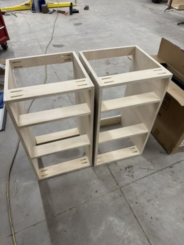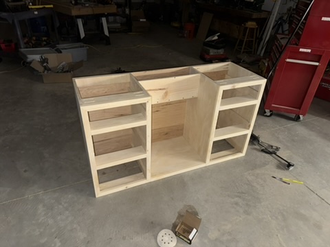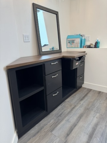 This is a piece that is built specifically for this space. With the angled wall, I decided to add a couple of shelves on the side, which are great for both storage and decoration. Featured are a couple of progress pictures, which are provided for every client. With a laminate walnut top and black painted cabinets, it is a beautiful piece that quickly became the focal point of the room.