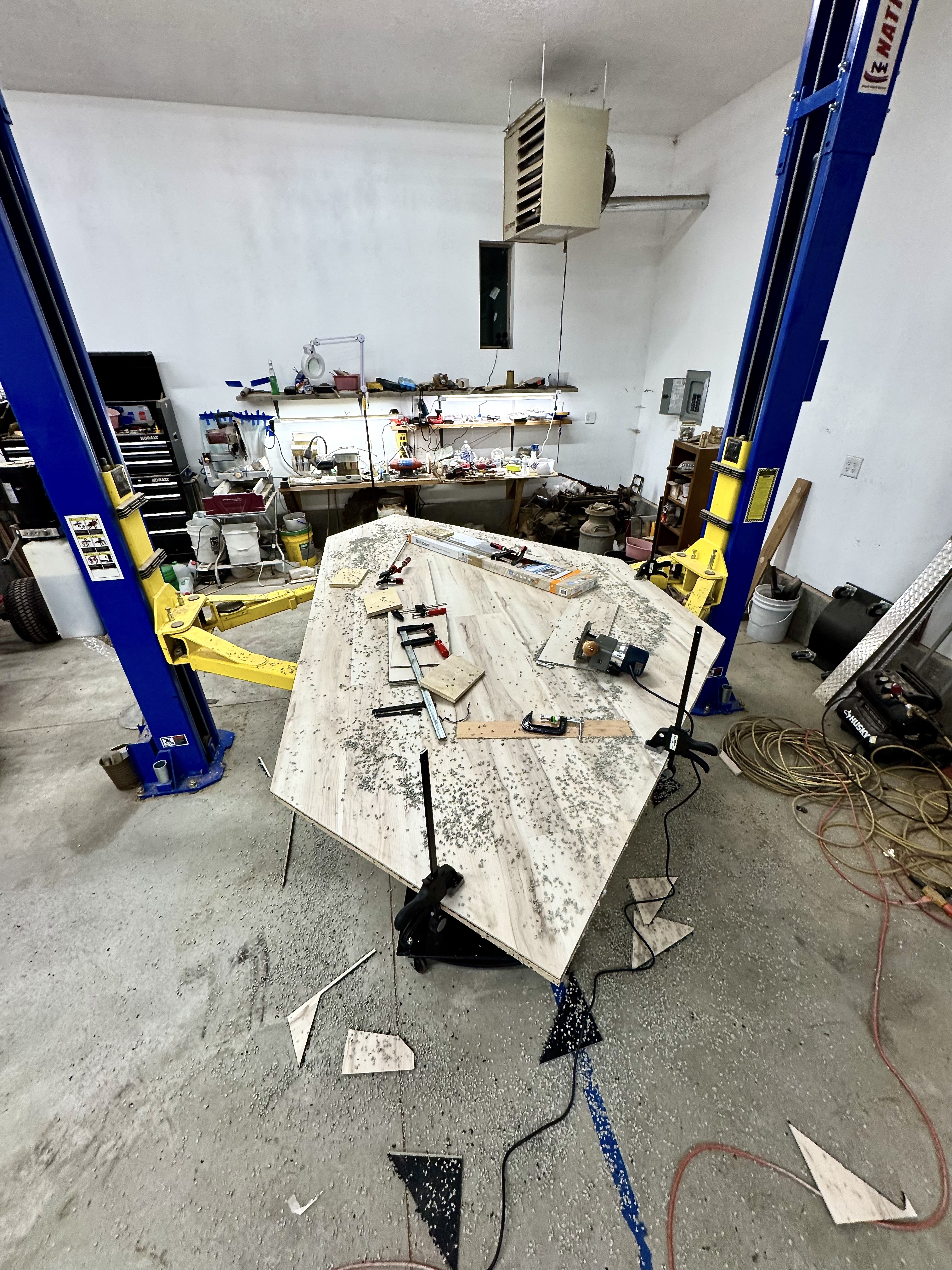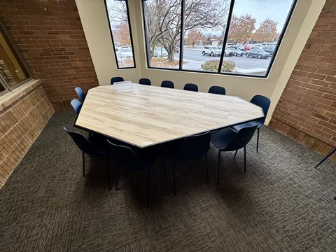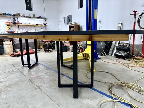 This piece is beautiful. And for me, the designer and creator, it is one that pushed my limits more than any piece before it. With the odd shaped room, and the want of having chairs all around it, it is one that while not easy to figure out, it was possible. Following many drawings and measurements, this was the final design we came up with. Following the request of the client to keep it cheap, yet durable, I put a lvp flooring as the countertop, which is built to last. Wrapped with black aluminum channel, it also doesn’t flex but can stay thin, at just 1 inch thick. To support this, I also had to add 3 black aluminum legs, built to match, and then a cedar wrap around the supports to keep the beautiful look.